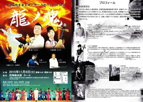中国伝統音楽とカンフーのスペシャル公演 「龍の魂」 開催予定!! 音楽家・劉偉氏とJCM民族楽団、研究会のジュニアとシニアの生徒・講師の徐言偉が共演 ◎チケット好評発売中!! 日時:2015年11月8日(日)PM3:00~5:00(2:30開場) /場所:西陣織会館…